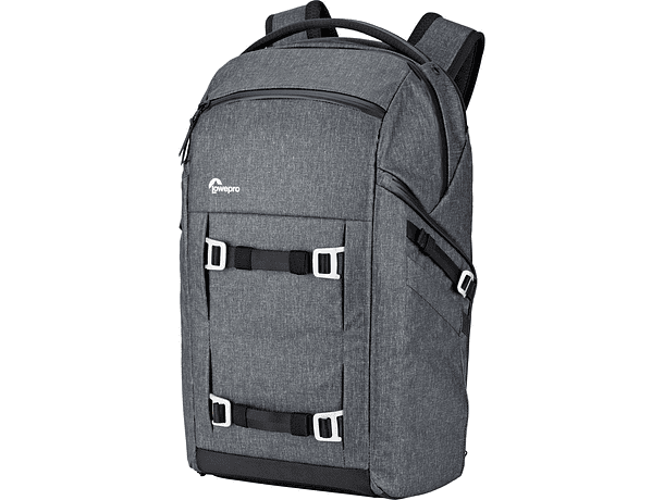 - Bolsillos laterales de malla y correas de compresión para asegurar un trípode compacto y una botella de agua.