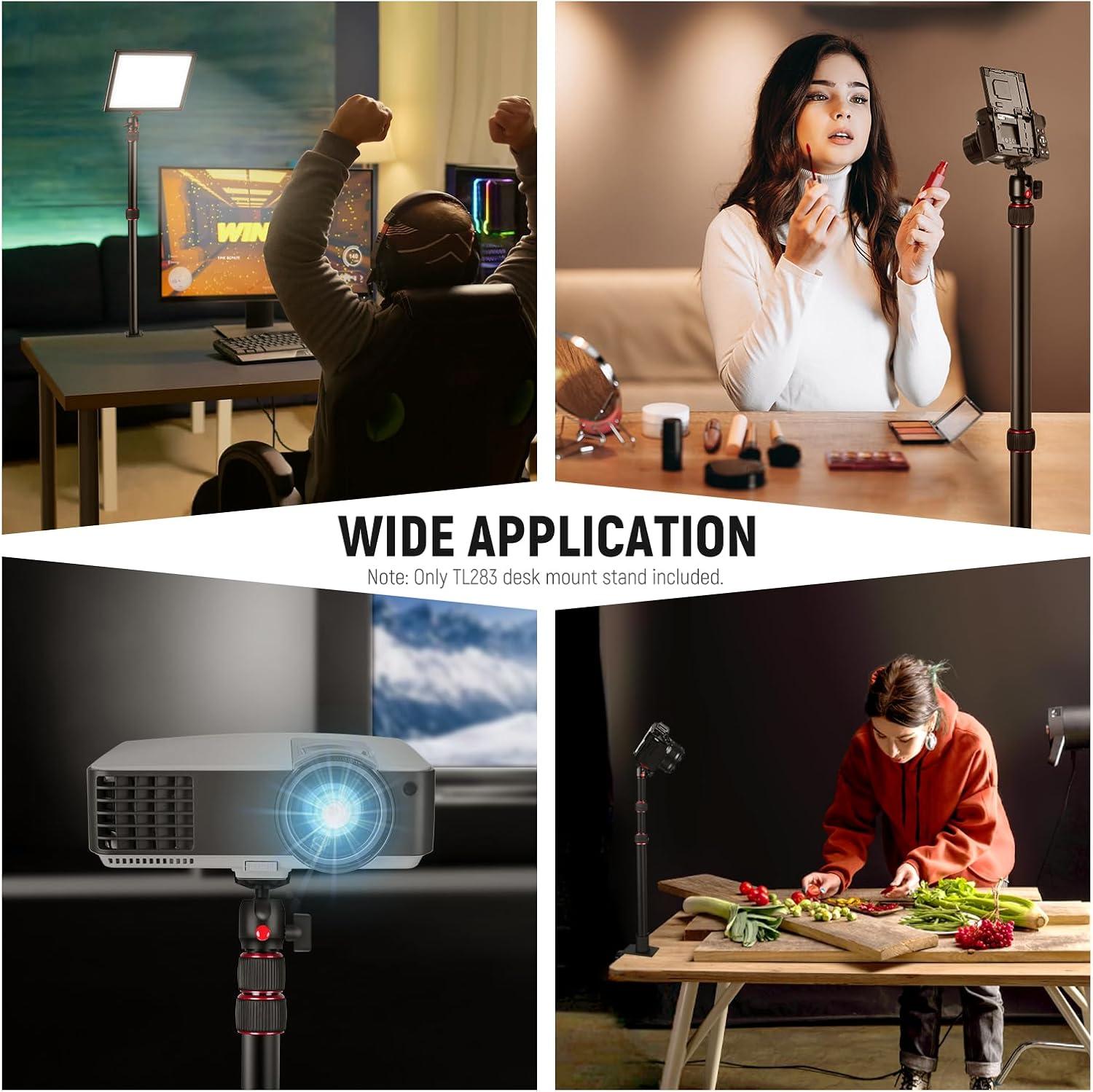 El Soporte de Escritorio NEEWER TL283 es una solución versátil y robusta para montar cámaras, teléfonos y otros dispositivos en superficies de escritorio, ideal para transmisiones en vivo, videoconferencias, fotografía y más.