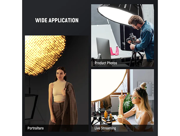 - Diseño parabólico: Proporciona una iluminación uniforme y envolvente, perfecta para retratos profesionales.
