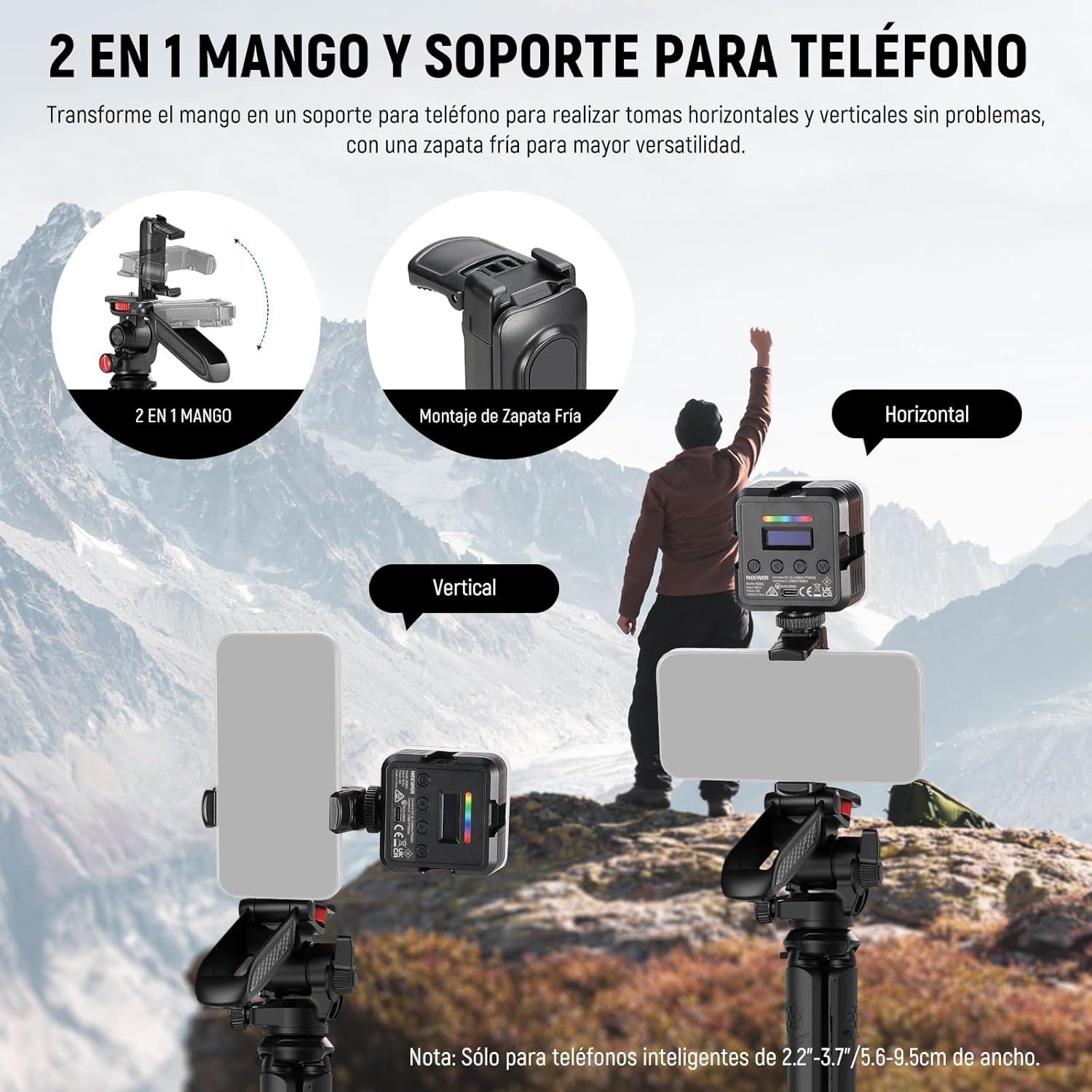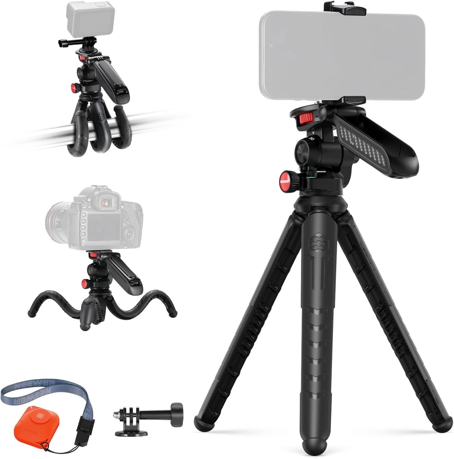 - El Neewer TP36 es un trípode flexible y compacto diseñado para ofrecer estabilidad en diversas superficies y ángulos. Sus patas flexibles permiten envolverlo alrededor de postes, ramas o barandillas, facilitando tomas creativas en diferentes entornos. Compatible con cámaras DSLR, cámaras de acción, smartphones y otros dispositivos de hasta 2 kg. Incluye un cabezal de bola integrado que permite ajustes precisos y un soporte oculto para smartphones con zapata fría para accesorios adicionales. Además, cuenta con un control remoto Bluetooth para capturas a distancia.